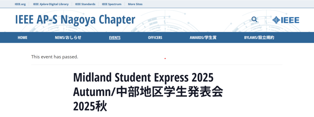 竹村君,村山君(M2),小熊君(M1)の三人が2025年12月12日(金)に名古屋国際センターで開催されたMidland Student Express 2025 Autumn/中部地区学生発表会2025秋(MSE)で研究発表を行いました.MSEはIEEE AP-S/MTT-S Nagoya Chaptersが春と秋の年二回開... -