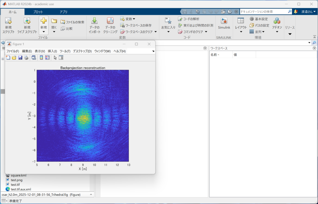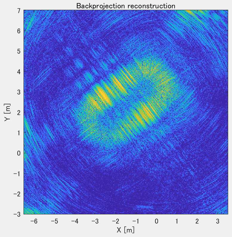 本システムを用い,現在円軌道合成開口レーダ(Circular SAR)による撮像実験を行っています.上記の画像は自動車の周囲をドローンで周回し,レーダ画像を生成した例です.詳細については今後本Webサイトの記事や学会にて発表していく予定です.