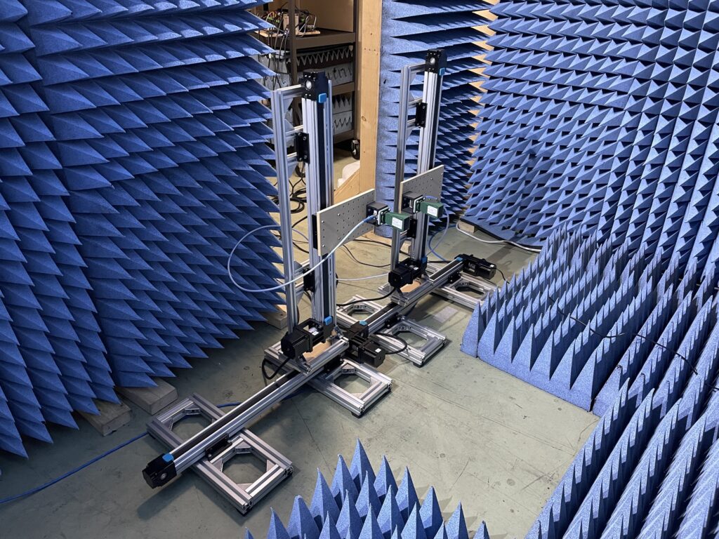 上記写真はリニアガイドを組み合わせて製作したX-Yスキャナです.平面上でのアンテナ走査を実現できます.上記写真では2セットのX-Yスキャナが置いてあり,それぞれ独立した動作が行えます.これにアンテナを固定してネットワークアナライザと接続し,疑似的なMIMO(Multiple-Input Multiple-Output)レーダの実験を行っています.