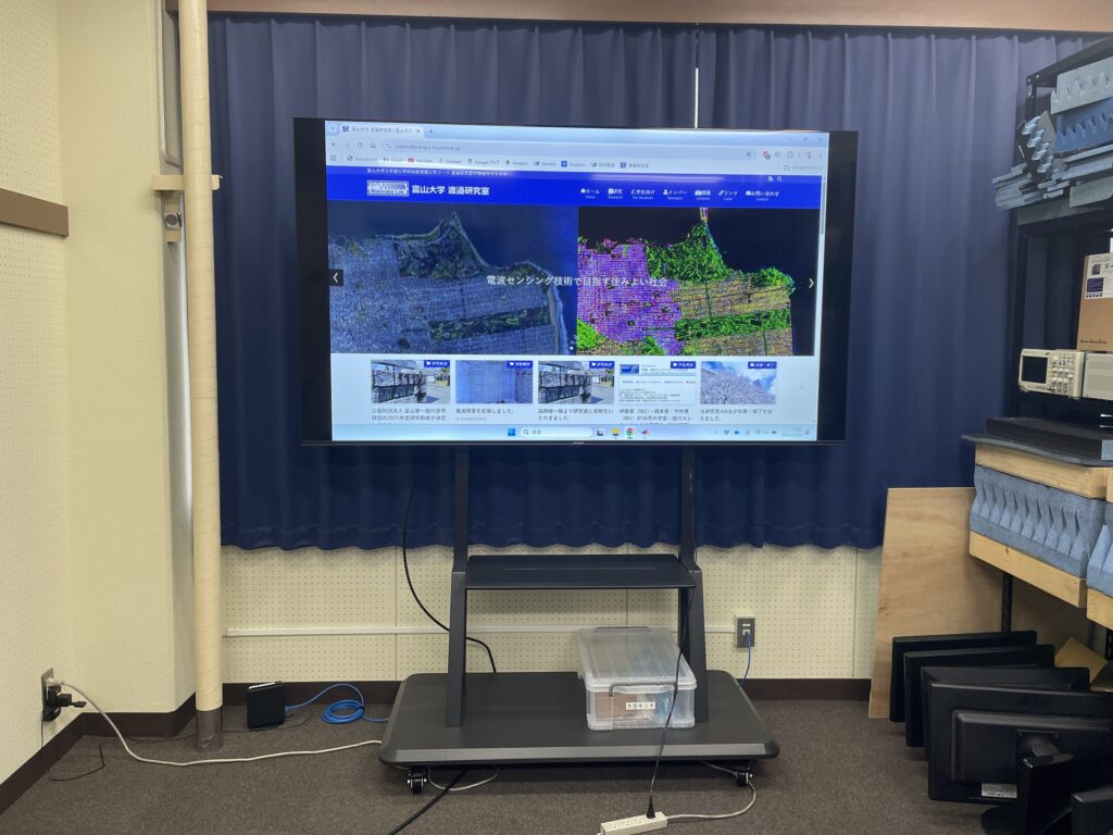 JAPANNEXTの85インチ大型モニタJN-V85U-Mです.ミーティングや進捗報告でスライドや資料を映すのに用いています.以前は古いプロジェクタを使用していましたが,部屋を暗くしないといけない,解像度が低く文字が見えにくいなど不満点が多かったので,思い切って大型モニタを導入することにしました.