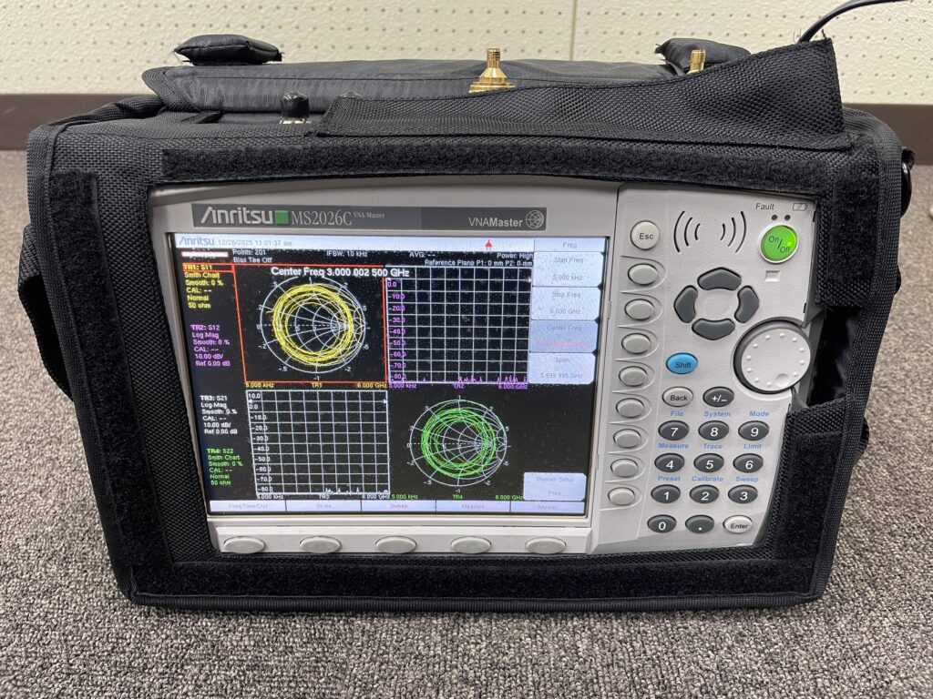 AnritsuのポータブルネットワークアナライザVNA Master MS2026Cです.6 GHzまでの周波数で測定が行えます.実験室以外にも様々な場所に持ち運んで測定が行えるので便利です.