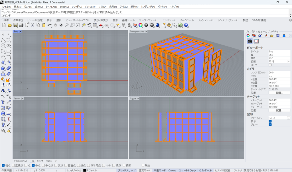 3D CADソフトです.3Dプリンタでの出力やCNCフライスでの加工を行うための3Dモデルを作成するのに用います.電波暗室もRhinocerosで設計しました.