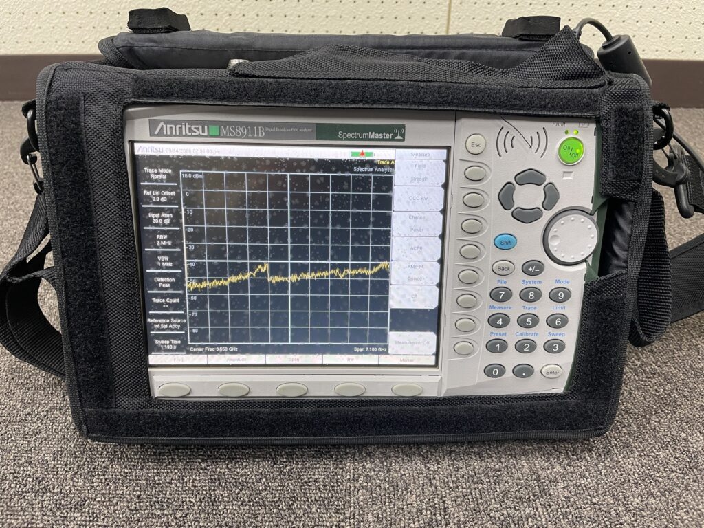 AnritsuのポータブルスペクトラムアナライザMS8911Bです.スペクトラムアナライザは電気信号や電波を周波数ごとに分解し,どの周波数にどれくらいの強さの成分が含まれているかをグラフで可視化・分析する測定器です.本製品は元々地上デジタル放送の信号を測定・解析するデジタル放送フィールドアナライザと呼ばれる機器なのですが,当研究室ではスペクトラムアナライザとしてのみ使用しています.7 GHzまでの周波数で測定が行えます.ポータブルネットワークアナライザ同様,実験室以外にも様々な場所に持ち運んで測定が行えます.